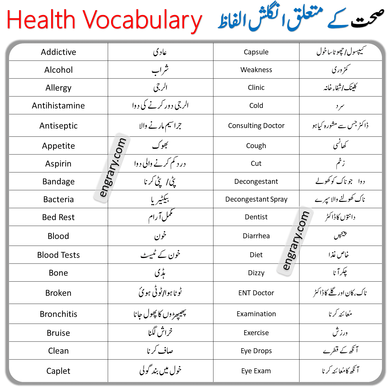 Health Vocabulary Words With Urdu Meanings. This Vocabulary help Speak English with doctors or even if you do not speak English, these words are now commonly used with your native languages like Urdu, Hindi, or any other local language.